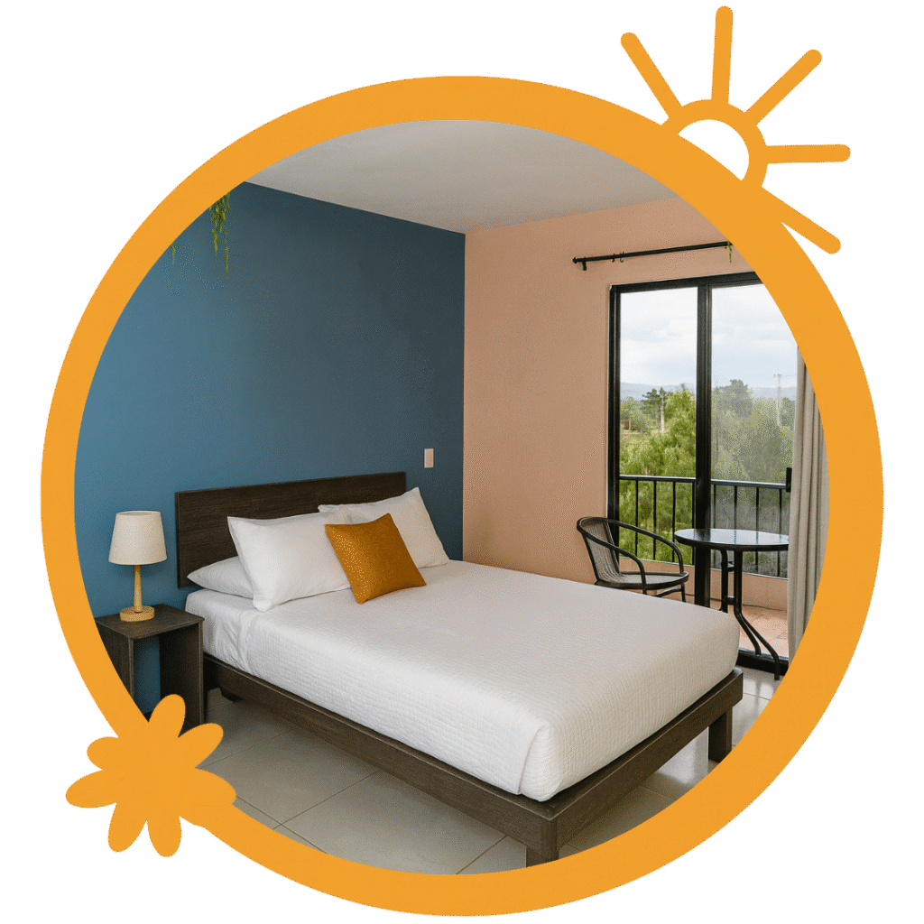 Acogedora y funcional, equipada con cama matrimonial, perfecta para viajeros que buscan un hospedaje cómodo y accesible cerca de las pirámides.